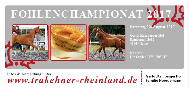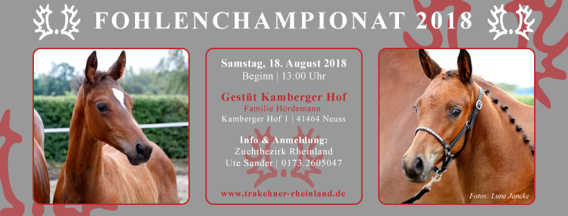 Leider muss das Fohlenchampionat 2018 ausfallen! Es liegen uns nur 5 Anmeldungen, jedoch sehr viele Absagen vor. Wir sind sehr traurig, dass es in diesem Jahr den rheinischen Trakehnerzüchtern nicht die Chance bietet, die besten Fohlen des Jahrgangs zu präsentieren und zu vergleichen.