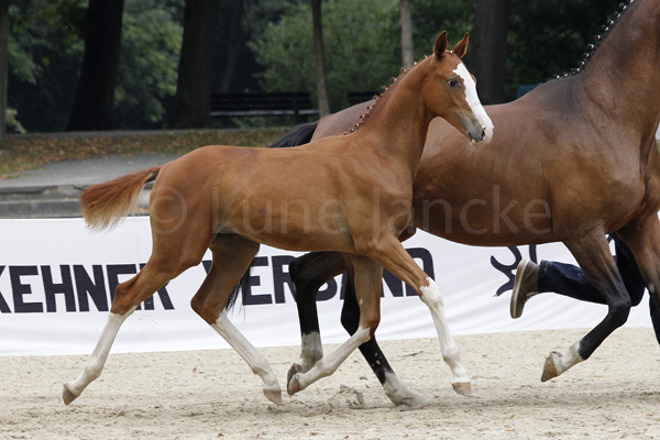 Auch der Siegertitel ging an einen Enkel des großen Biotop. Seine wohl bedeutendste Tochter und bereits zweifache Hengstmutter, die doppelt prämierte Jahressiegerstute Shakira, lieferte mit dem Sieger des Championats auch in 2010 erneut ein Spitzenfohlen. Herausragend in Gangqualität und Seitenbild, bestach der schon sehr männlich-selbstbewusst auftretende Sohn des Polarion. Langbeinig und trocken, Trakehner Typ in Vollendung, immer bergauf – so präsentierte sich der stolze Sieger 2010. Gezogen wurde er im Gestüt Heinen, Issum. (SB)