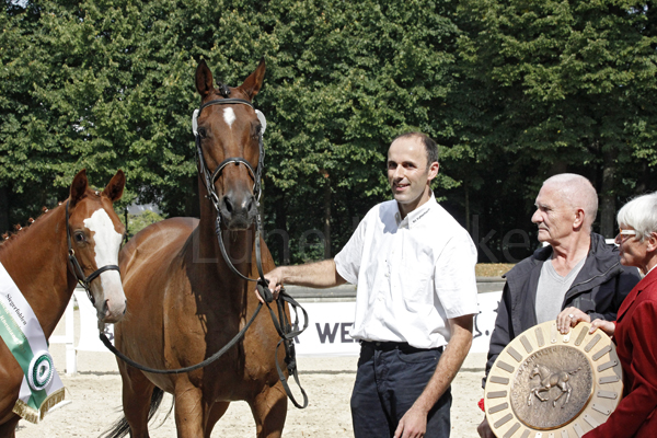 Familie Heinen erhielt den wertvollen Wanderehrenpreis aus den Händen des 1. Vorsitzenden des Trakehner Verbandes Dr. Norbert Camp. Weiterhin wurde Familie Heinen für ihre besonderen züchterischen Leistungen mit der Goldmedaille der Landwirtschaftskammer NRW ausgezeichnet.